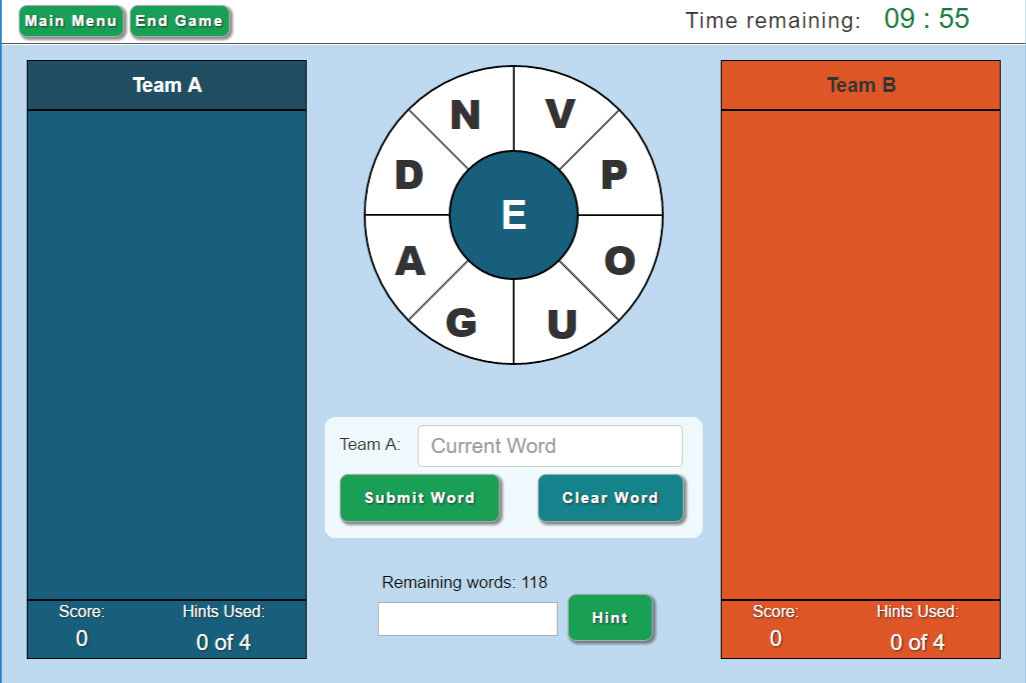 Each team has access to 4 (four) free words by pressing the hint button. Each time the hint button is pressed, a word that can be spelled with the current word wheel will appear. Once a team has used the hint button 4 (four) times, they can no longer press it. The game ends once the timer runs out, or by pressing the End Game button at the top-left of the screen.